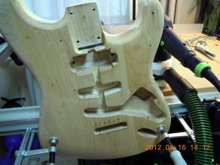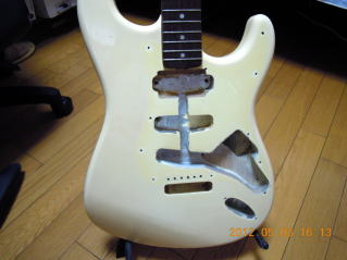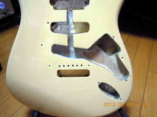 Casinoの方がなかなか進まないので、ストラトにも手を付けてしまいました。正直言って、乗り気では無かったのですが。とは言え、始めると瞬く間の出来事です。付いている部品をここぞとばかりに、引っ剥がします。内臓を全部取りだすと、この様になります。内側にもウレタンの塗装がしっかり乗っているので、これを木の下地が見えるまで削ります。銀色に見える部分はノイズ対策のためアルミホイールです。(よくこんな細かいことをやってたね、と我ながら感心してしまいます)