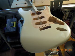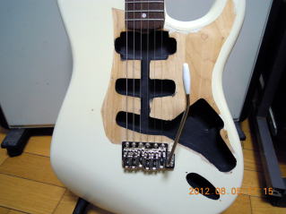 全体の塗装が上がればあとは部品を組み込むだけなのですが、早々簡単には片付きません。先ずはキャビティ部分に導電塗料を塗ります。これがまたドロドロの液体でかなり丁寧に混ぜないと、ダマダマ状態でとても塗料と呼ぶには程遠い感じ。どちらかといったら”泥”です。それが充分乾くのを待って、もう少し厚塗りをして、また待つ。塗装って本当に我慢の連続で、いい加減投げ出したくなります。今回は既存の部品を殆ど交換してしまったので、部品ごとの評価は出来ません。導電塗料の乾燥を待つ間、弦を張るための部品を先につけてしまいます。さて、音出し・・・・・、???、!