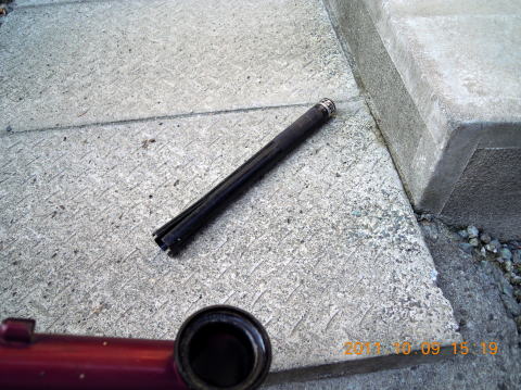 写真右のような工具を使って、はい,この通り。フレームとタイヤで色を統一していますが、私はコイツを密かに,”Red Racer”と呼んでいます。見た目は細いですが、乗ると熱くなります。次に新しいワンを圧入します。写真右下中央がヘッドパーツです。その隣がカーボンフォーク。上下ワンを取り付け圧入します。左2つ下が圧入工具をセットした状態。なんだか工具がたくさん必要に見えますが、ヘッドに関してはこの2点だけです。
